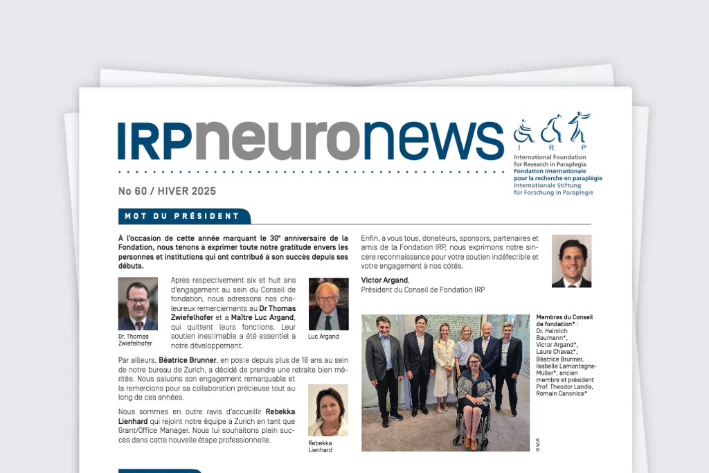 L’IRP publie deux fois par année IRPNEURONEWS, une newsletter en français et en allemand présentant les différentes activités de la fondation, les événements qu’elle organise et les progrès dans les différents domaines de la recherche en paraplégie.